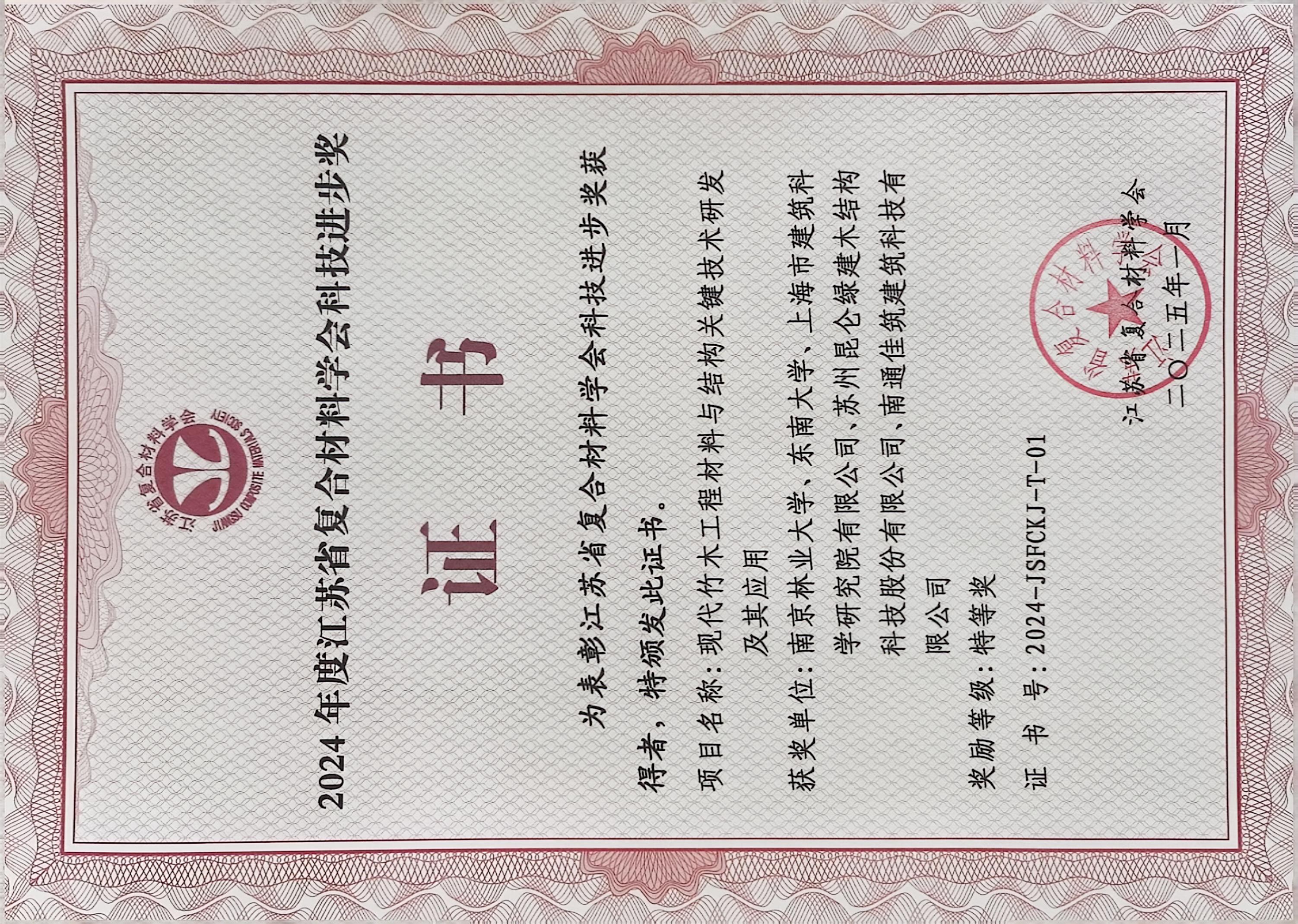 2025年1月19日上午,江苏省复合材料学会七届二次理事会在南京航空航天大学召开,色情片 魏洋教授牵头,陈佳炜、杜浩、丁一等老师参与完成的《现代竹木工程材料与结构关键技术研发及其应用》荣获2024年度江苏省复合材料学会科技进步特等奖。