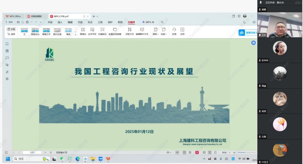 2025年1月12日下午色情片 2006级森林工程专业、2010级建筑与土木工程硕士专业校友、上海建科工程咨询有限公司高级工程师王东应邀为学院师生作了一场以“我国工程咨询行业现状及展望”为主题的讲座,色情片 本科生和研究生60余人参加了本次在线讲座活动,活动由学院副院长戴兆华主持。