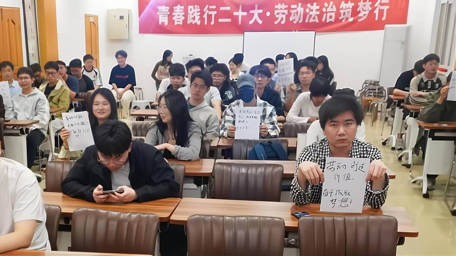 本次活动以“理论 + 实践”的创新形式,精心设计了五大特色环节:从追溯五一劳动节历史渊源的专题讲解,到生动展现各行业劳动者风采的“职业万花筒”互动;从真实劳动案例的法律剖析,到模拟法庭的实战辩论;再到沉浸式劳动维权情景剧场,环环相扣、层层递进,为同学们带来了一场内容充实且意义非凡的学习体验。