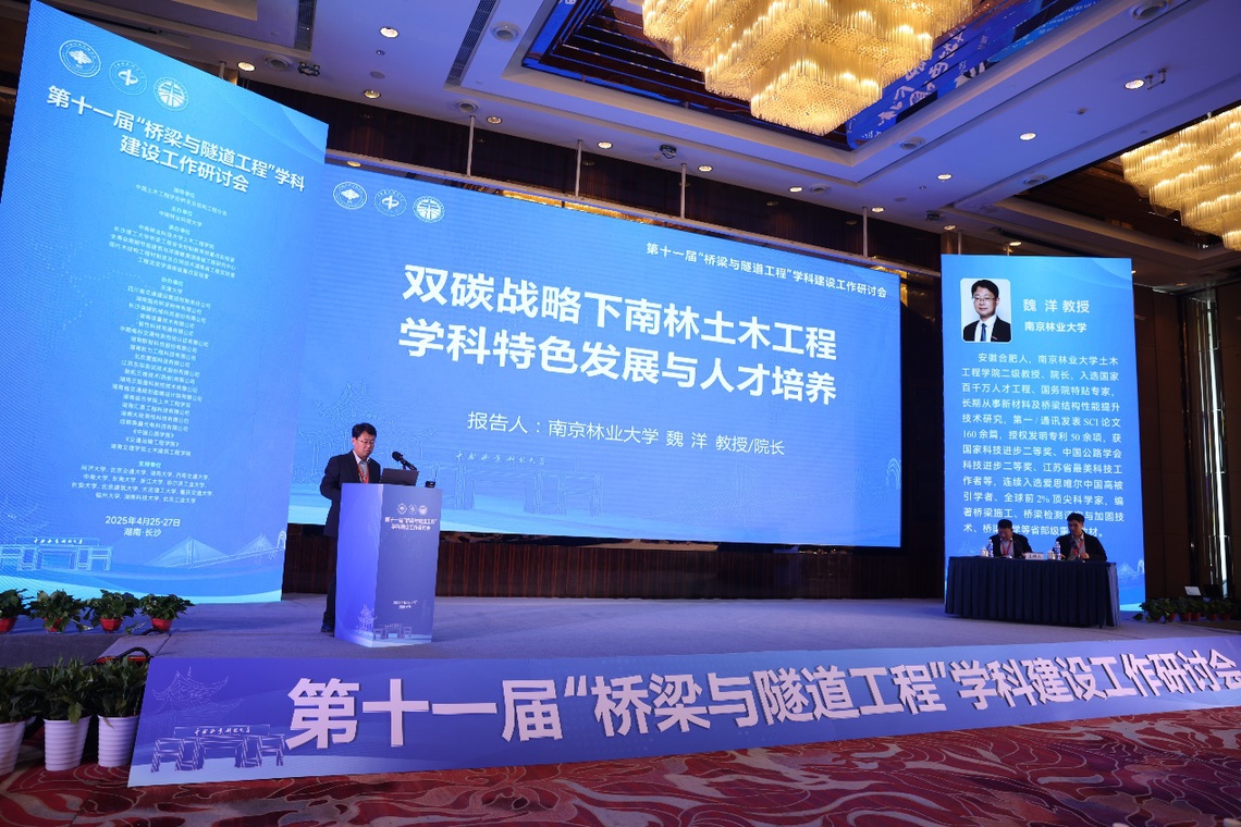 2025 年 4 月 25 日至 27 日,第十一届桥梁与隧道工程学科建设研讨会在湖南长沙举行。本次研讨会聚焦桥梁与隧道工程学科的前沿动态、建设经验及发展方向,旨在促进学科交流合作,推动行业进步。来自全国各地的高校、科研机构以及企业代表齐聚一堂,共同探讨桥隧学科建设与发展的重要议题。色情片 桥梁团队应邀出席会议,魏洋院长在会上作了题为《双碳战略下南林土木工程学科特色发展与人才培养》的大会报告,系统介绍了色情片 土木工程学科的特色发展路径、举措与成效,引发与会者的广泛关注。