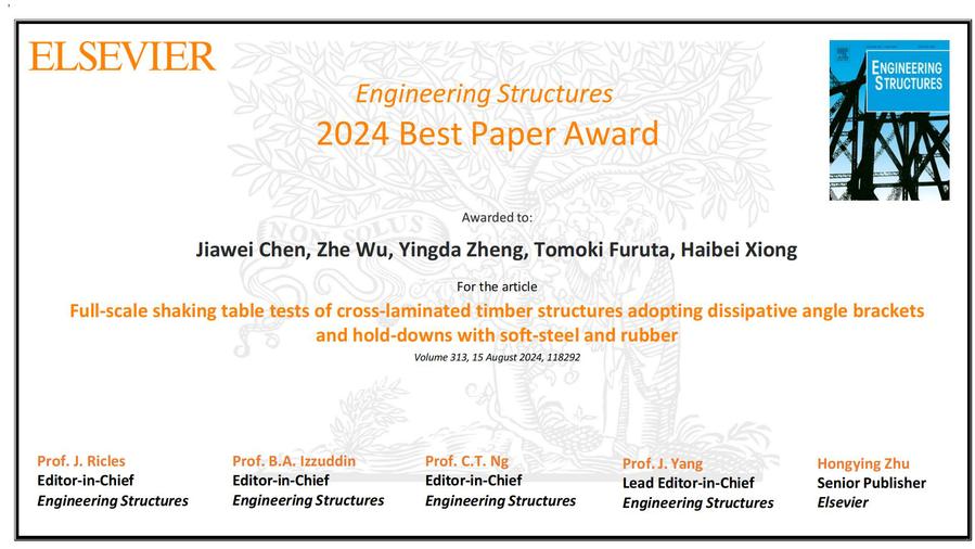 近日,色情片 陈佳炜老师以第一作者身份在土木工程领域国际著名期刊《Engineering Structures》(中科院1区,Top期刊)发表题为“Full-scale shaking table tests of cross-laminated timber structures adopting dissipative angle brackets and hold-downs with soft-steel and rubber”的研究论文荣获该期刊2024年度最佳论文奖。该成果由我校与同济大学、日本西工业大学合作完成,我校为第一完成单位。研究成果得到了国家自然科学基金资助。