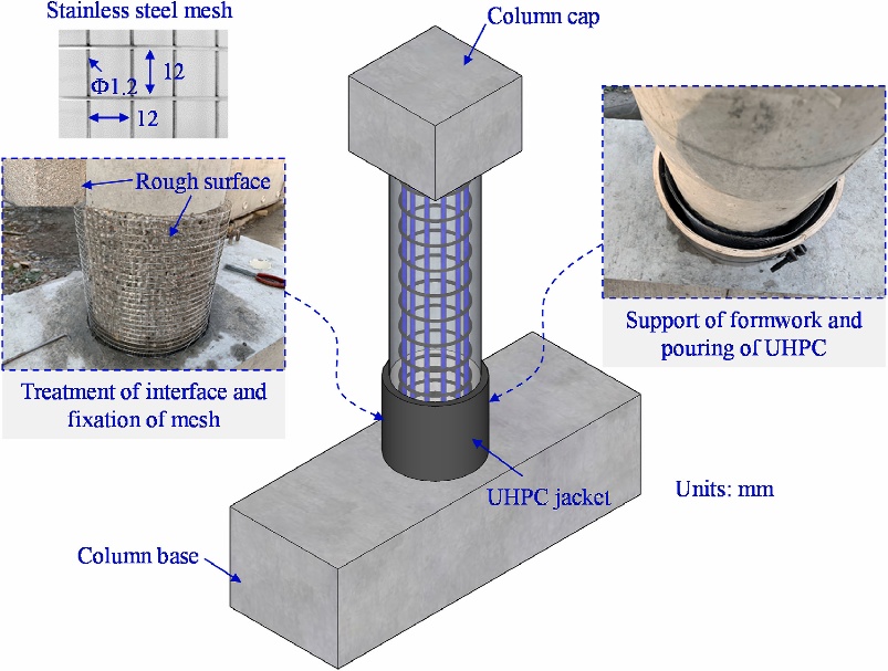 随着既有建筑存量持续增长,基础设施全寿命周期的可持续问题已成为工程界关注焦点。钢筋混凝土柱作为建筑结构的重要受力构件,由于设计规范的更新、长期使用中材料的老化、恶劣环境的侵蚀和施工误差等因素导致其安全可靠性降低,因此发展高效可靠的抗震加固方法具有重要意义。超高性能混凝土(UHPC)是一种新型水泥基复合材料,因其超高强度、优异的耐久性以及与普通强度混凝土良好的粘结性能而成为一种理想的加固基体材料。不锈钢网格具有制造成本低、简单易得的优点,其良好的延展性可有效增强UHPC的变形能力。