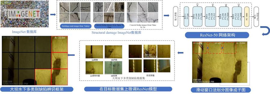 针对传统深度学习模型数据依赖大、泛化能力弱的问题,提出融合域内与域间迁移学习的两阶段策略,结合深度残差网络ResNet50 与弱监督可视化机制,实现了水下混凝土结构多类别缺陷的高精度辨识与损伤区域的弱监督定位。