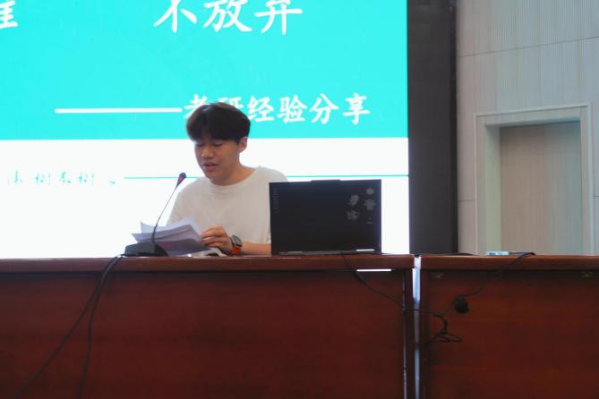 会议伊始,三位优秀毕业生以“过来人”身份分享实战经验。升学本校的纪呈臣结合自身备考经历,从前期基础夯实到后期冲刺提分,为学弟学妹们系统梳理了考研全周期的学习重点与策略;跨考东南大学电子信息专业的陈忠毅,则以“土木人”跨考的独特视角,深入剖析跨专业考研的信息差、知识壁垒等现实挑战,并给出“慎抉择、强执行”的行动建议,鼓励在场同学若选择跨考便全力以赴;曾经历考研调剂的徐晓宇,以“调剂是信息战更是心理战”为切入点,结合自身从焦虑迷茫到积极行动的真实历程,提醒同学们:若一志愿复试失利,需快速调整心态,主动搜集信息、把握每一个调剂窗口,用行动打破“上岸”困局。