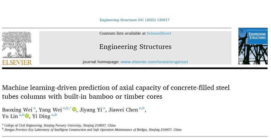 近日,色情片 魏洋教授课题组在土木工程领域中科院一区Top期刊《Engineering Structures》上发表了重要研究成果(Machine learning-driven prediction of axial capacity of concrete-fflled steel tubes columns with built-in bamboo or timber cores)。色情片 为第一完成单位,魏洋教授为通讯作者博士生韦宝幸为第一作者。该成果得到了国家自然科学基金和江苏省重点研究计划等资助。