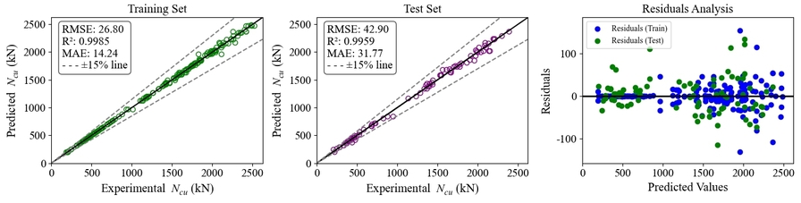 论文提出的模型系统纳入了混凝土强度等级(C30~C60)、竹/木芯截面尺寸(50mm×50mm-150mm×150mm)、钢管径厚比(15~35)等关键影响因子,通过人工神经网络、支持向量机等机器学习算法的对比优化,最终实现预测值与实验值误差控制在 3% 以内,精度远超传统理论计算模型。
