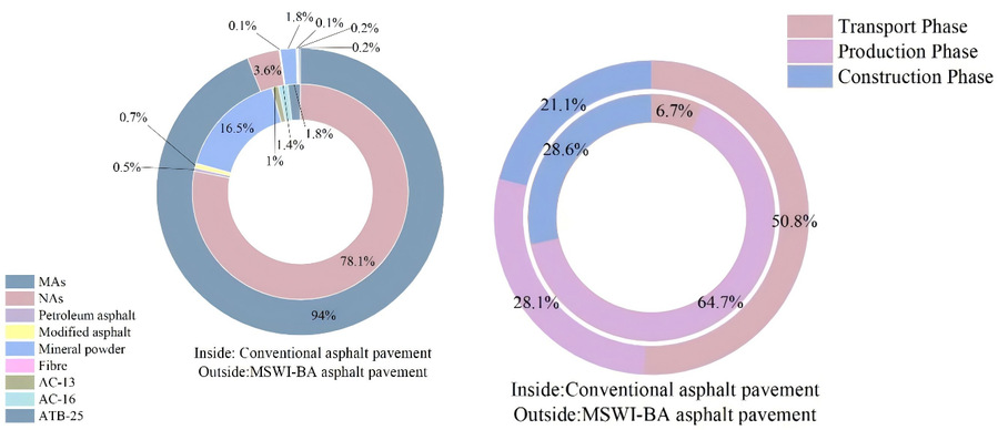 结果表明,MSWI-BA用于沥青路面建设替具有显著碳减排效益。在最大替代情景方案下,全生命周期碳排放可降低约31%,节省天然集料约2.78万吨。碳减排效果在基层中尤为突出,降幅达51%~78%。研究也指出,炉渣长距离运输会抵消部分碳减排效益,因此建议推进垃圾处置设施区域化布局与回程装载协同调度,以进一步提升净减排效果。该研究为生活垃圾焚烧炉渣的高值化、规模化利用提供了关键技术,也为我国发展绿色低碳型交通基础设施提供了新思路,具有重要的环境、经济和社会意义。