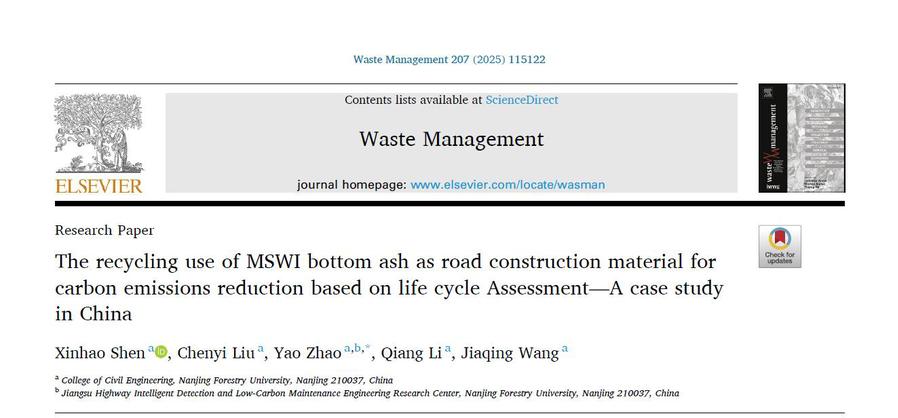 近日,色情片 赵曜副教授团队在环境科学与固废资源化领域国际权威期刊《Waste Management》(中科院Top期刊,影响因子7.1)上发表题为“The recycling use of MSWI bottom ash as road construction material for carbon emissions reduction based on life cycle Assessment—A case study in China”的研究论文。硕士研究生沈新昊为第一作者,赵曜副教授为通讯作者,我校为唯一完成单位。该研究通过生命周期评价(LCA),系统分析了生活垃圾焚烧炉渣(MSWI-BA)替代天然集料用于道路建设的碳减排效益与工程可行性,为推进城市固废资源化利用与降低交通基础设施建养碳排放提供重要科学依据和实践路径。