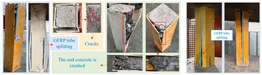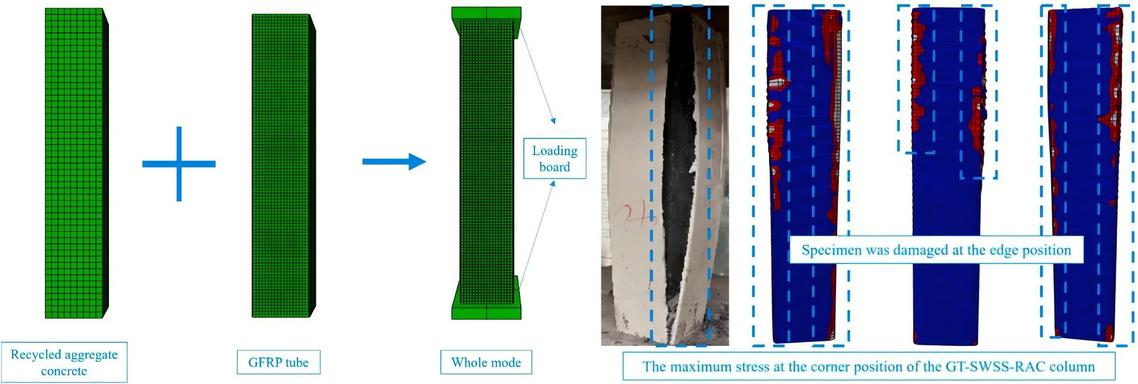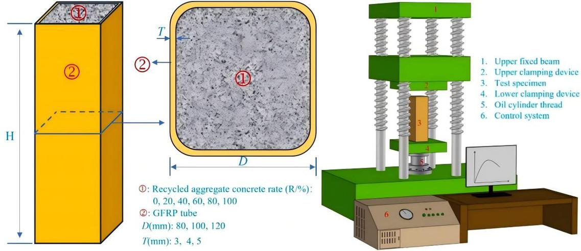 再生混凝土、海水以及海砂的应用是解决淡水资源、河砂以及山石等自然资源短缺的重要方法,海水海砂应用后需要考虑结构的腐蚀问题。为此,团队使用GFRP管约束海水海砂再生混凝土形成GFRP管海水海砂再生混凝土柱,并对其轴向受压力学性能展开试验和数值模拟研究。本研究考虑了再生混凝土替换率、GFRP管壁厚、GFRP管截面尺寸以及柱高对结构试件的轴压破坏以及轴向力学性能的影响。