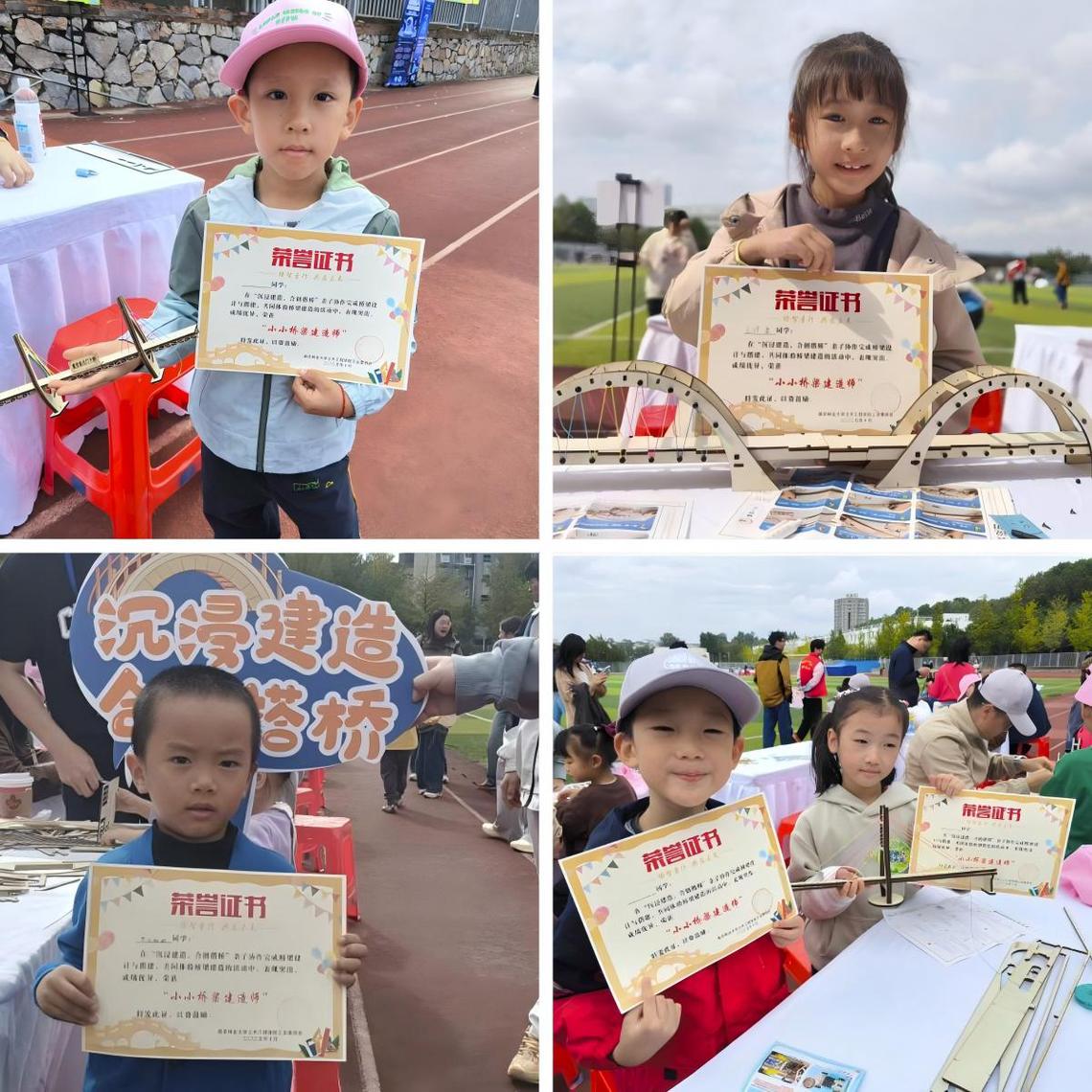 活动最后,每位参与活动的小朋友都获得了一份特别的荣誉——由学院工会颁发的“小小桥梁建造师”认证证书。手捧证书的孩子们脸上洋溢着自豪与喜悦,在与自己亲手建造的“桥梁”合影中,活动圆满落下帷幕。
