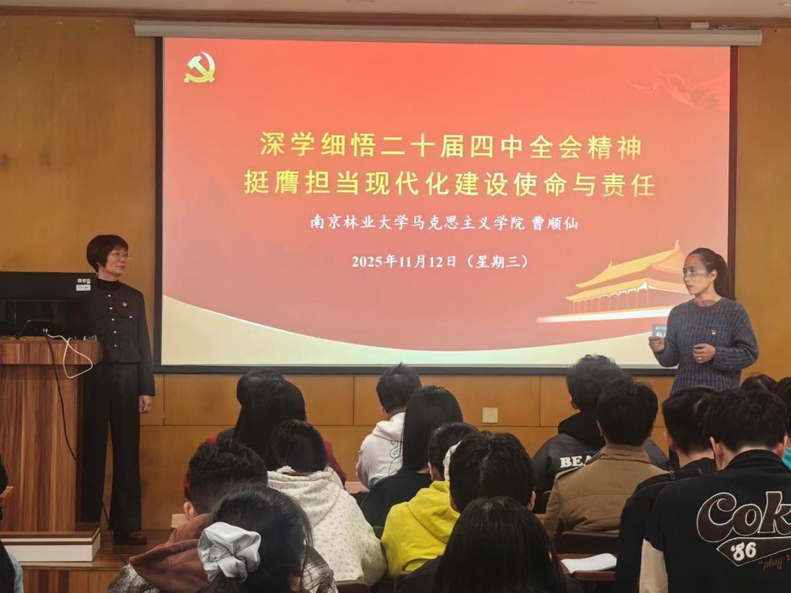 2025年11月12日,学院分党校在3324报告厅举办2025年新党员培训讲座。活动特邀马克思主义学院曹顺仙教授,为学院新党员作题为“深学细悟二十届四中全会精神,挺膺担当现代化建设使命与责任”专题党课。讲座由学院党委副书记、副院长柳任飞主持。