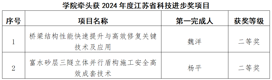 魏洋教授主持的“桥梁结构性能快速提升与高效修复关键技术及应用”、杨平教授主持的“富水砂层三隧立体并行盾构施工安全高效成套技术”两项成果均荣获江苏省科技进步二等奖。此次获奖,体现了学院在桥梁性能提升、岩土加固与城市地下工程等特色优势领域的扎实科研实力与高水平技术转化能力。