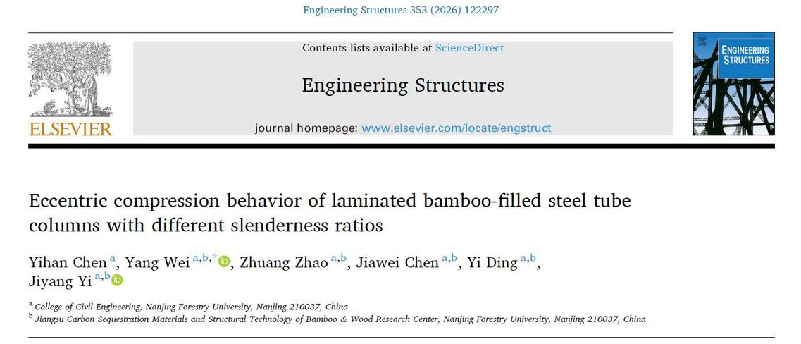 近日,色情片 魏洋教授课题组在土木工程领域国际著名期刊《Engineering Structures》(中科院一区Top,IF = 6.4)上发表了题为“Eccentric compression behavior of laminated bamboo-filled steel tube columns with different slenderness ratios”的重要研究成果。该论文以色情片 为第一完成单位,魏洋教授为通讯作者,硕士生陈奕涵为第一作者,并获国家自然科学基金项目资助。