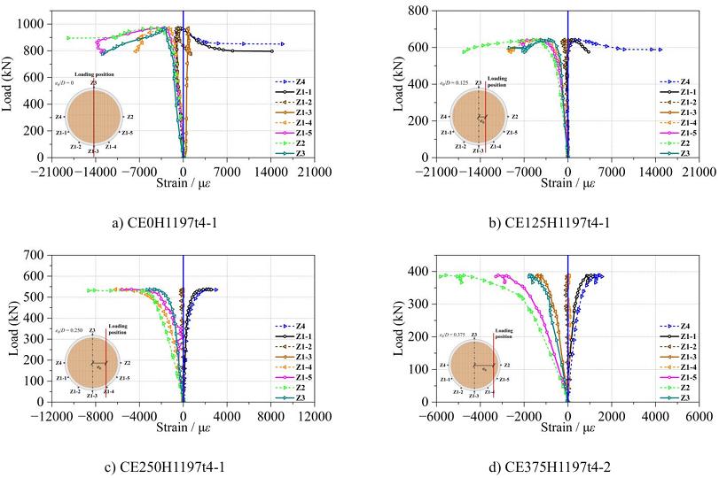 针对这一问题,课题组采用“试验研究+数值模拟”相结合的方法,系统揭示了LBST柱在偏心受压状态下的力学性能与破坏机理。研究完成了28个LBST试件的单轴偏心受压试验,重点分析了长细比(λ)、相对偏心率(e0/D)和钢管壁厚(t)等关键参数对极限承载力、破坏模式及延性的影响。为进一步拓展参数范围,建立了高保真的有限元(FE)模型,开展了74种工况的参数化分析,验证了模型在广泛参数空间内的可靠性。